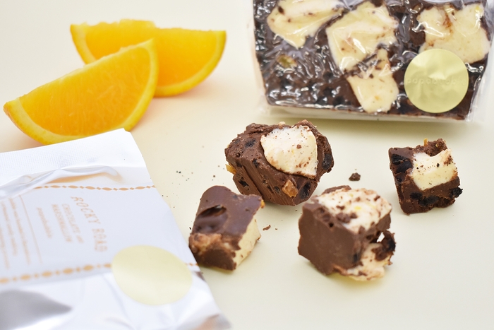 冬の新作ロッキーロードはミルクチョコレートにコアントローを加え高級感ある大人な仕上がりに。冬にぴったりな深い味わいのロッキーロードです。