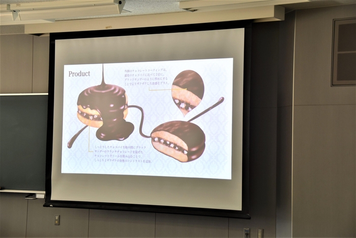 講演後には学生たちが考えたコラボ商品企画の提案を聞き、中村氏が講評しました。チョコレートのパイ菓子の中にクランキーチョコ商品を組み合わせる提案では「自分にはない発想。百貨店などの高級路線で販売するのもいいかもしれない」や、化粧品ブランドの人気リップを全て飴で商品化する案には「菓子というより、コスメのプロモーションのように行うのも面白いのではないか」など、学生たちのアイデアにマーケティングの視点からアドバイスを行っていました。