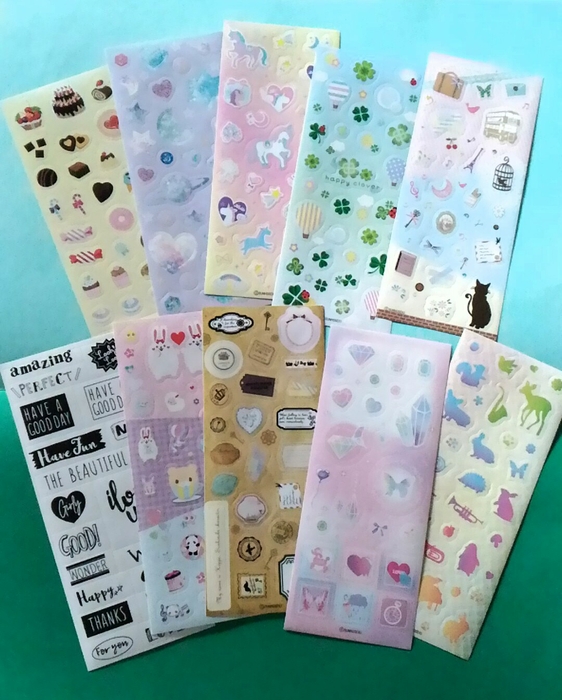 流行のユニコーン、ゆめかわから可愛い動物たち、スイーツモチーフ、四つ葉のクローバーなど、た~っぷり10枚をセットにしてなんと99円でお届け!!