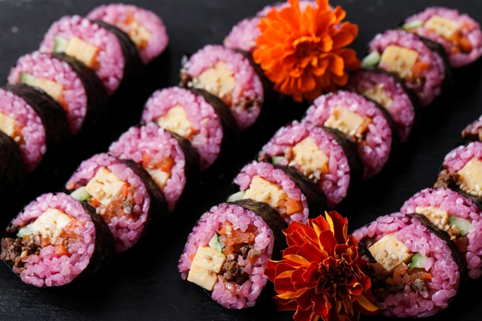 カプレーゼとコチュジャンのチーズバーガー(イタリア×韓国)/三重県産アオサと茸のきしめん/地場野菜の揚げたて天麩羅/イカ墨のアランチーニ(イタリア)/自家製肉味噌のレッドキンパ(韓国/ランチのみ)/鮮魚の握り寿司(ディナーのみ)