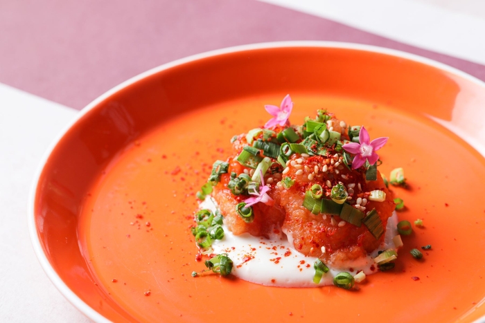 チャンジャとエリンギのペペロンチーノ(イタリア×韓国)/本日のパスタ(イタリア)/旬魚のロースト カポナータのピュレとタプナード(イタリア)/白身魚のフリット 青ネギと韮とヤンニョムソース(韓国)