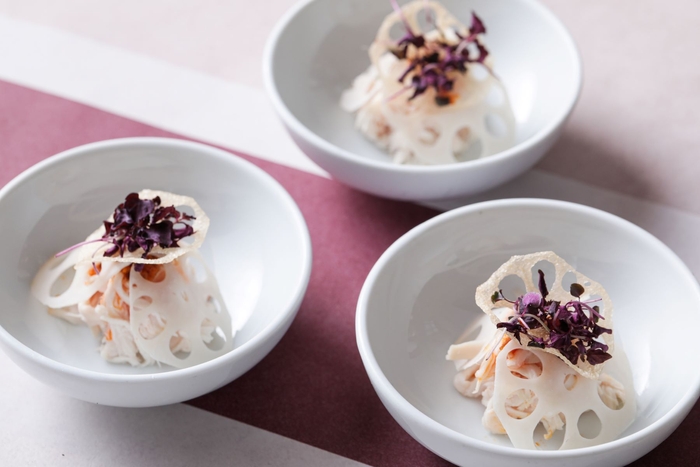 若鶏と蓮根のナムル コラトゥーラの香り(イタリア×韓国)/海老と今市蕪のインサラータ レモン風味(イタリア)/鯖と焼き茄子のマリナータ(イタリア)/本日のテリーヌ キムチのラヴィゴット(韓国)/南瓜のムースリーヌ スペキュロスのクランブル
