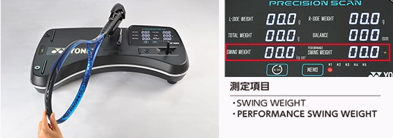 さらに、従来のスウィングウェイト(振った時の重さ)に加え、重量とバランスの測定結果を反映した弊社独自の新指標「パフォーマンススウィングウェイト※2」を測定。プレーヤーの体感にさらに近づけた適正な数値を算出することで、ユーザーに最適なラケットやカスタマイズを提案し、快適なプレーをアシストします。