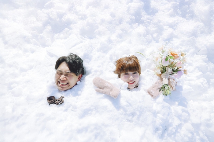 雪をかけ準備していた小物を置き撮影するまで約5分。震えるほど寒い中、素敵な笑顔で楽しんでくれたおふたりに感動。人生初の真冬の北海道で同じ関西出身のおふたりを撮った思い入れのある写真で受賞、嬉しいです!