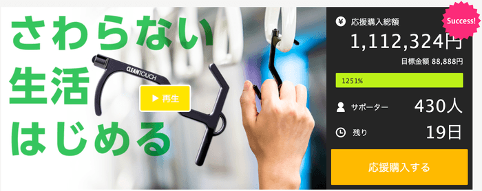 株式会社ウィズキュリオス(本社:福岡県福岡市/代表取締役:上崎 圭哲)は、みんなが触ってしまう場所を代わりにタッチして接触感染の予防に活躍する道具【クリーンタッチ】を「Makuake」にて先行予約販売を開始し、プロジェクトの販売個数が900個を越えました。