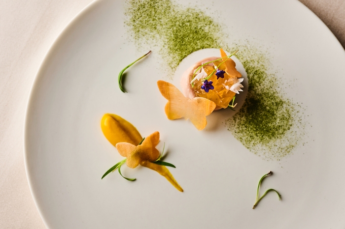 今年3月に、長野県御代田町に開業した「THE HIRAMATSU 軽井沢 御代田」。浅間山の南麓にゆるやかに広がる広大な森の敷地では、縄文土器も出土しており、古より人々の営みがあったことがわかっています。そんなプリミティブな記憶を残す地は今も豊かな自然に恵まれ、清らかな水や空気に育まれた食材が旬ごとにいれかわっていきます。この土地の恵みをひらまつならではのクオリティーで再編集しながら、ここでしか味わえない美食体験を追及しています。