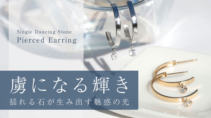左右両方から中石を吊り下げることで揺れ続けるダンシングストーンがゴージャスな輝きを放つとしたら、今回のシングルダンシングストーンは上部1点だけで中石を吊り下げたことにより、石が上下左右に小刻みに揺れてダンシングストーンと比べて華奢で繊細な輝きを放つのが特徴。