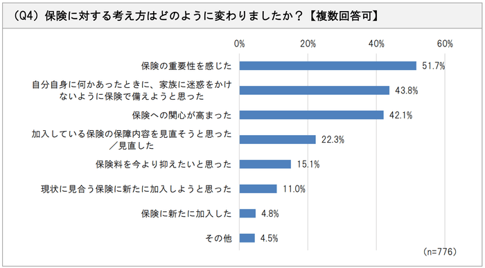 「保険に対する考え方は変わった(どちらかというとを含む)」と回答した方に理由を聞いたところ、「保険の重要性を感じた(51.7%)」が最も多く、「自分自身に何かあったときに、家族に迷惑をかけないように保険で備えようと思った(43.8%)」が続きました。