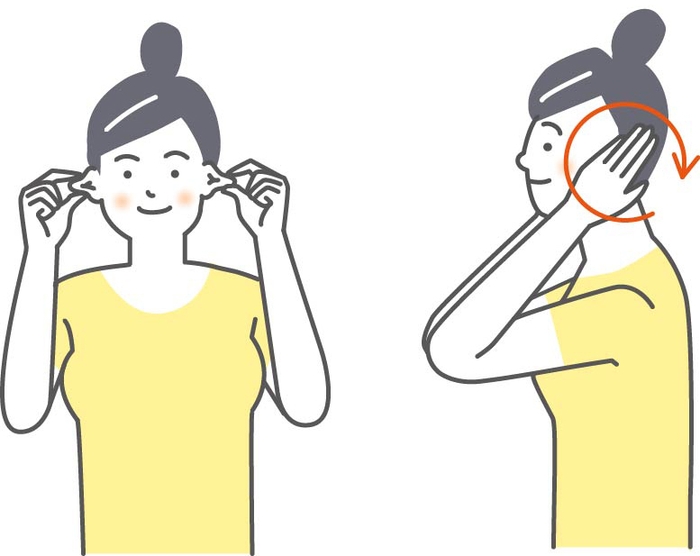 ④ 耳全体を手で覆い、後ろに向かって円を描くようにゆっくり5回、回す