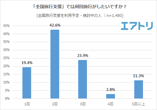 全国旅行支援の希望利用回数を聞いたところ、最も多かったのは「2回(42.6%)」となり次いで「3回(23.9%)」、「1回(19.4%)」でした。