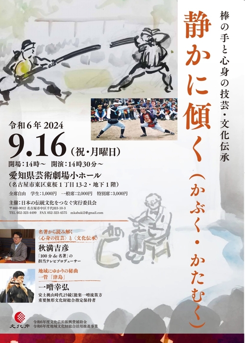日本の伝統文化をつなぐ実行委員会主催、『静かに 傾く(かぶく かたむく)』が2024年9月16日(祝・月)に愛知県芸術劇場小ホール(名古屋市東区東桜一丁目13番2号)にて上演されます。
