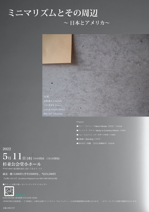 CIRCUIT(代表:鈴木治行)主催、『ミニマリズムとその周辺 ~ 日本とアメリカ~』が2022年5月11日 (水)に杉並公会堂小ホール(東京都杉並区)にて開催されます。チケットはカンフェティ(運営:ロングランプランニング株式会社、東京都新宿区、代表取締役:榑松 大剛)にて発売中です。