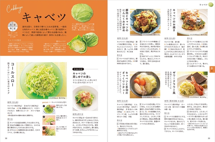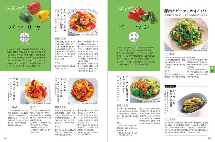 肉じゃがやロールキャベツなど、主菜になる野菜のおかずも充実。また、野菜を使った炊き込みごはんや混ぜごはん、パスタやめんなどのレシピもいろいろ。全レシピにカロリーと塩分を表示しています。