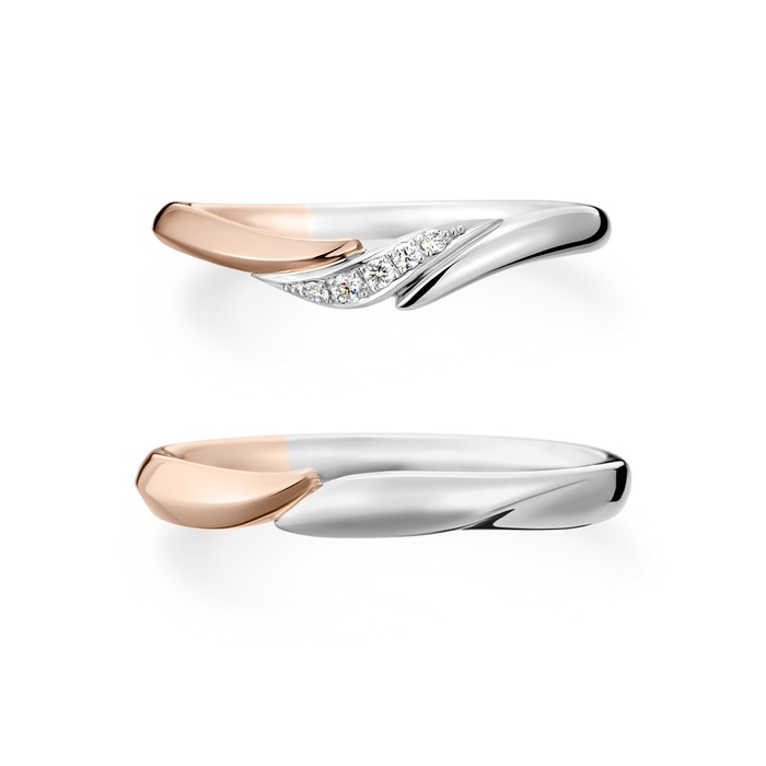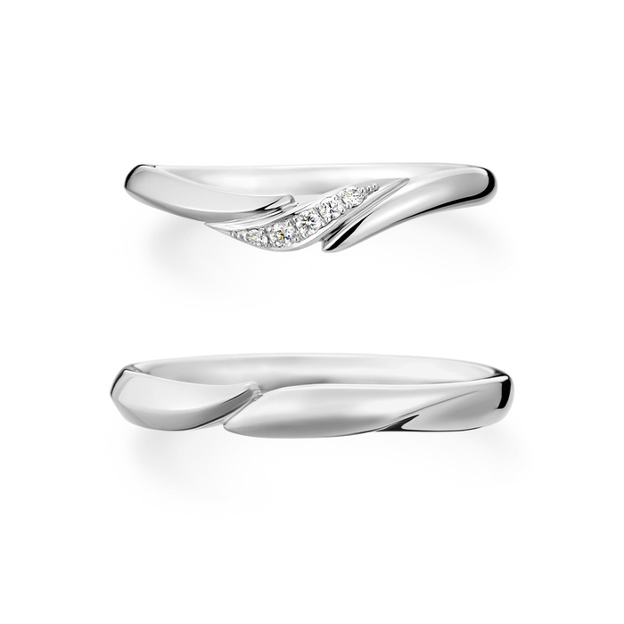 片方はゆるやかなV字のラインにメレダイヤモンドが5ピース輝き、エレガントな印象。もう片方はすっきりとしたストレートラインで、それぞれ異なる要素がありながら、お揃い感もある結婚指輪です。