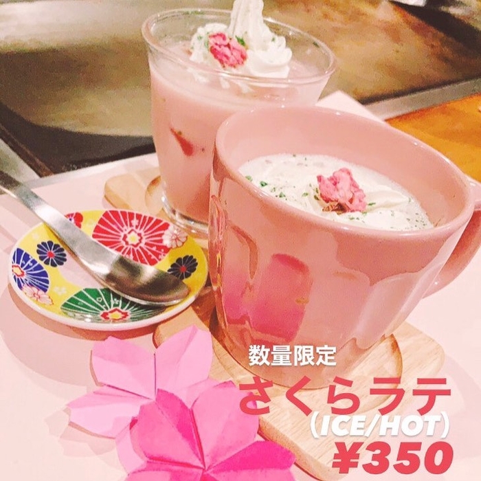 桜香る優しい甘さのラテにホイップ、抹茶パウダー、桜の花をあしらいました。
