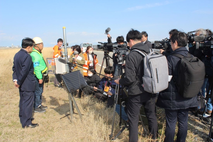 この日、関空では辻教授と、装置を開発した山梨県の自動車部品メーカー「T.M.WORKS」の渡邊孝夫さんが滑走路から約100㍍離れた緑地帯に鉄製の支柱を立てて、電源用のソーラーパネル、バッテリー、バードソニック本体とスピーカーなどを手際よく取り付けていきました。頻発するバードストライクは日本の空の玄関口の安全に直結する問題だけに、大勢の報道関係者が取材に詰めかけました。