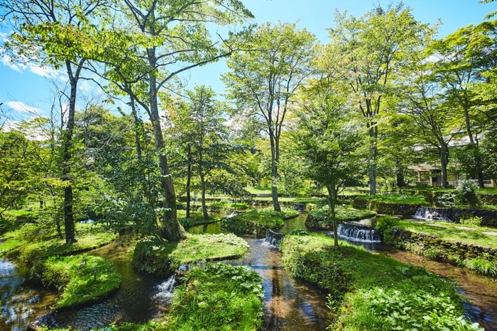 現代を休む日、谷の集落に滞在する。離れの客室は水辺を囲み、部屋のテラスからは季節のうつろいが感じられます。「軽井沢野鳥の森」に面した豊かな自然環境にて、休息の時間を満喫できる滞在型リゾートです。