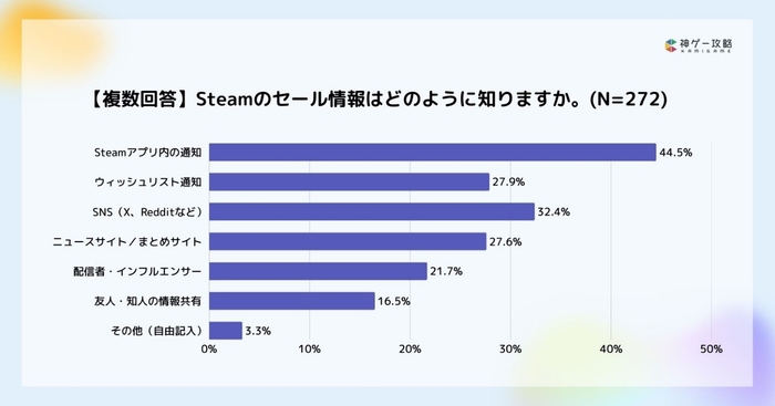 Steamのセール情報は、Steamアプリ内の通知で知るという人が44.5%で最多でした。次点はXやRedditなどのSNSが32.4%という結果でした。