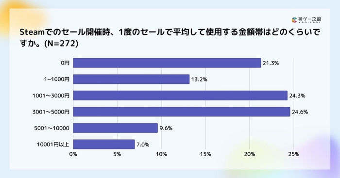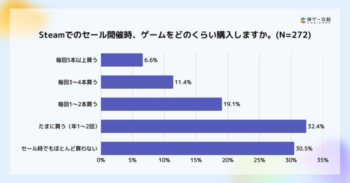 Steamでのセール開始時のゲーム購入本数は、年1〜2回ほどが32.4%で最多。次点でセール時でもほとんど買わない人が30.5%という結果でした。