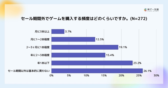 ・セール期間外で「基本的に買わない」ユーザーは26.1%だが、セール期間外でも年1本以上ゲームを購入しているユーザーは合計73.9%