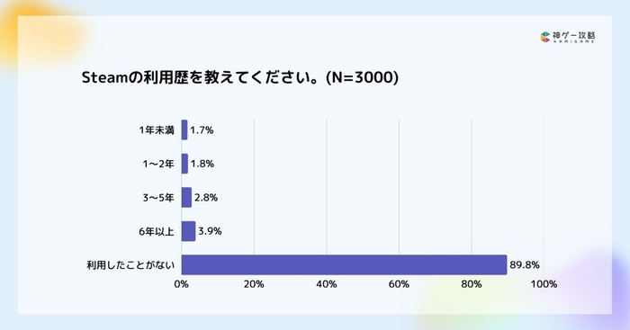 非ゲームユーザーを含む3,000人を対象に行った事前調査では、Steamを利用しているユーザーは全体の約1割でした。以降では、この1割の中から回答のあった272名を対象に、本調査結果を発表します。
