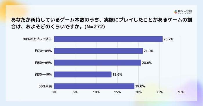 ・所持ゲームのうち「90%以上プレイ済み」は25.7%、一方で「30%未満」は19.0%