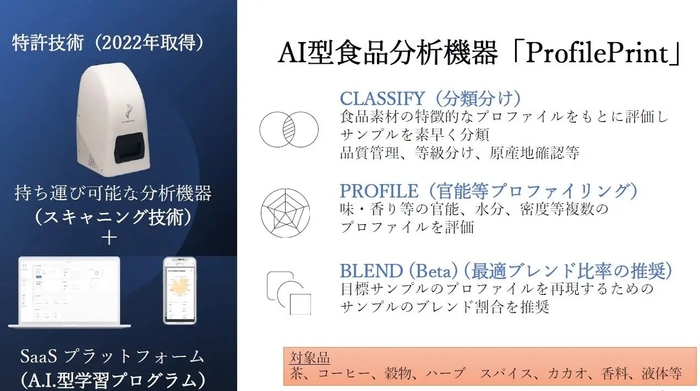 津南醸造が今回活用した日本酒の官能評価システムは、シンガポールのProfilePrint社が開発した食品の官能評価を数値化するシステムで、株式会社野村事務所のサポートのもと日本国内で導入されています。このシステムは、特許技術を用いたスキャニング機能とAI学習機能を組み合わせ、これまで人間による官能評価が主流だった食品評価を高度に再現しています。日本酒の評価においては、唎酒師による評価に非常に近い結果を出すことに成功しています。