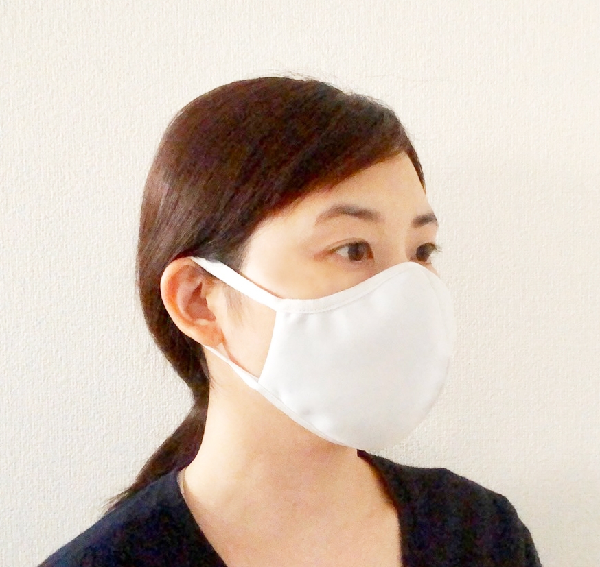 顔に合わせた形なので唇が布につきにくく、眼鏡も曇りにくいて形状になっています。