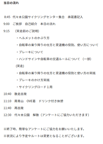 ※代々木公園内の練習で街での走行が危険と判断した場合、そこで終了とさせていただき、参加費の半額をご返金いたします。