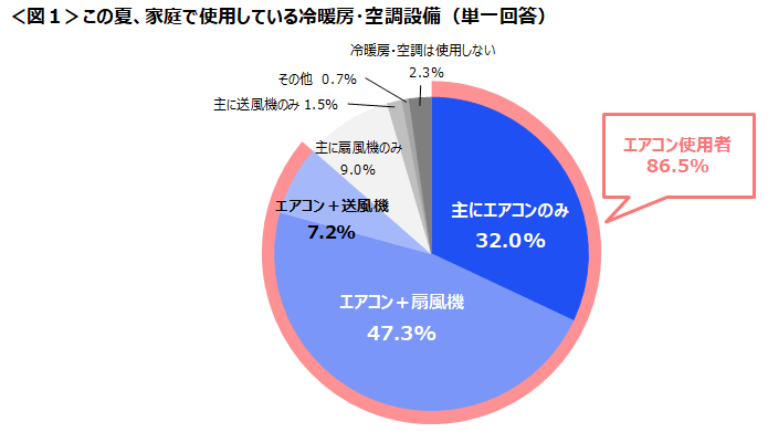 この夏、家庭では、約半数がエアコンと扇風機を併用。エアコンの使用率は86.5%。