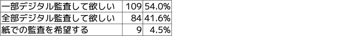 デジタル監査の経験ある・なしの区別なく回答していただいたQ1でも、部分的な実施を希望が54%、全部を希望が41.6%という結果だったので、現時点では紙との両輪が主流のようです。
