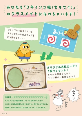 また「コジコジポップアップショップ 3年インコ組(セキセイ)」の店頭ではスタンプカードを配付いたします。スタンプカードにスタンプを2つ集めたお客様には、オリジナル名札カードを1枚プレゼント。スタンプは商品の購入がない場合でも、来店ごとに1日1回まで押すことが可能です。