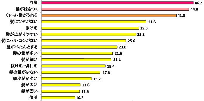 年齢を重ねるといろいろな部分に悩みが増えてくるもの。髪の悩みも例外ではありません。ポーラの調査によると、50歳以上の髪の悩みは、白髪、髪のツヤ、抜け毛、ハリコシ不足などの悩みが上位を占めます。カラーリングやヘアケア製品だけにとどまらず、ウィッグへのニーズもさらに掘り起こせると推察されます。