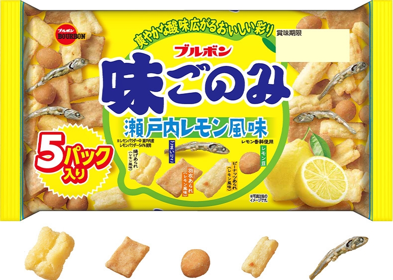 「味ごのみ瀬戸内レモン風味」は、当社のロングセラー商品“味ごのみ”を、瀬戸内レモンの果皮を使用しレモン風味に仕上げました。米菓や豆菓子のほか、かたくちいわしを使ったごまいりこをミックスしました。5種類の飽きのこないおいしさと、瀬戸内海の春を感じられるきゅんと酸っぱいさわやかなレモン風味をお楽しみいただけます。食べやすい小分けタイプとし、いつでも好きな量をお召しあがりいただけます。