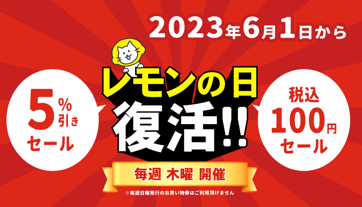 静岡県内を中心に66店舗展開する100円ショップ「100えんハウス レモン」(運営会社:株式会社ワタナベ、本社:静岡県静岡市葵区、代表取締役:渡辺 勝)は、2023年6月1日(木)から毎週木曜日にイベントセール「レモンの日」を再開します。また、毎週日曜日には100円のお買物券プレゼントキャンペーンも実施中です。