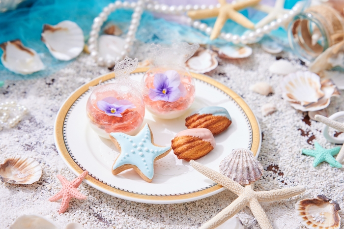 【ガトー】グレープフルーツのオーシャンゼリー/南国フルーツとココナッツのムースタルト/アイシングクッキー/人魚姫のカップケーキ/桃の貝殻トゥンカロン/貝殻マドレーヌ/フランボワーズのパンナコッタ