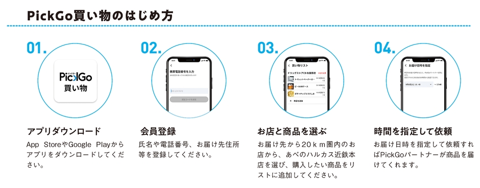 百貨店の商品をスマホアプリから注文し、当日中にご自宅に配送する「PickGo(ピックゴー) 買い物(※)」サービスを、第一弾としてあべのハルカス近鉄本店の食料品売場を中心に導入します。今後、さらに楽しくお買い物いただけるよう、対象売場や商品カテゴリを追加していく予定です。