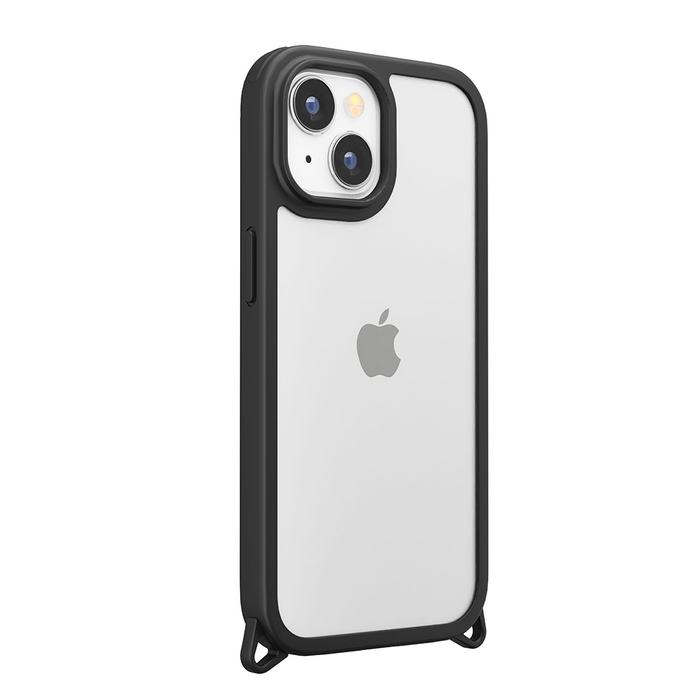 ケース四つ角には、ストラップホールをお好みの位置に変更出来るリングパーツ式を採用し、お手持ちのショルダーストラップ・ハンドストラップ等を自由に取り付けが可能です。ケース内側はエアークッションを採用し、軍用規格(MIL-STD-810G)の落下と振動試験をクリアした耐衝撃設計。ケース背面は薄さ0.3mmのポリカーボネイト素材でケースをつけたままMagSafe充電器を使用する事が可能です。サイド部分はやわらかく丈夫なTPU素材でボタン周りもしっかり保護します。サイド部分がやわらかい素材なのでケースの着脱も簡単です。