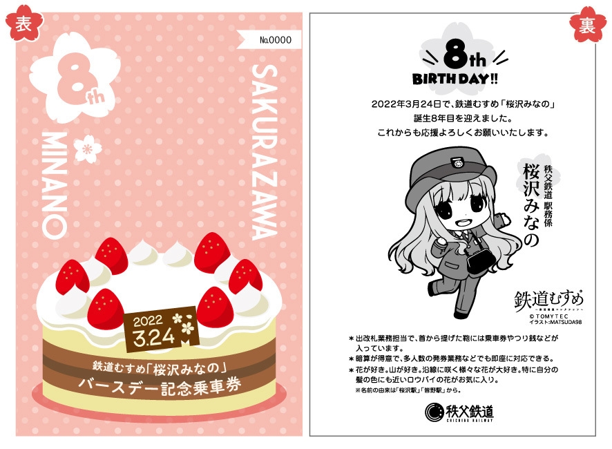 秩父鉄道株式会社(本社:埼玉県熊谷市、代表取締役社長:大谷 隆男)では、秩父鉄道の鉄道むすめ「桜沢みなの」が2022年3月24日(木)で8回目の誕生日を迎えることを記念し、「鉄道むすめ「桜沢みなの」8thバースデー記念乗車券」を通信販売「ちちてつe-shop」限定で発売します。当乗車券は、キャラクター型に切り取った乗車券に、A6サイズの特製台紙がセットになった記念乗車券です。