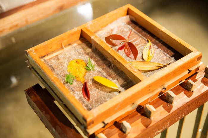 奈良時代からの歴史がある烏山和紙(からすやまわし)は、栃木を代表する和紙として知られています。館内では、この烏山和紙の手漉き体験を毎日無料で開催しています。秋には色づいた葉を漉き込んで、手作りの葉書きを持ち帰ることができます。
