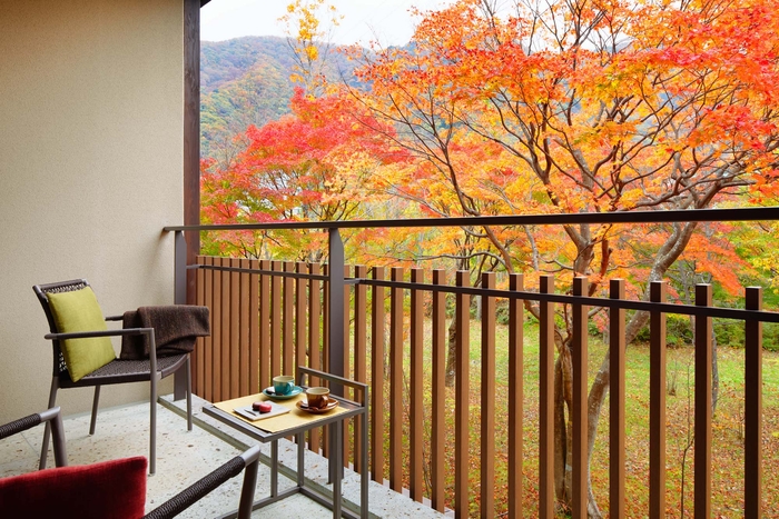 男鹿川の渓流沿いに佇む界 川治では、大浴場の露天風呂に浸かりながら、里山の紅葉を眺められる「紅葉露天風呂」を堪能できます。また客室や足湯をはじめ、敷地内のいたるところで紅葉を見ることができ、秋ならではの風情を感じられます。