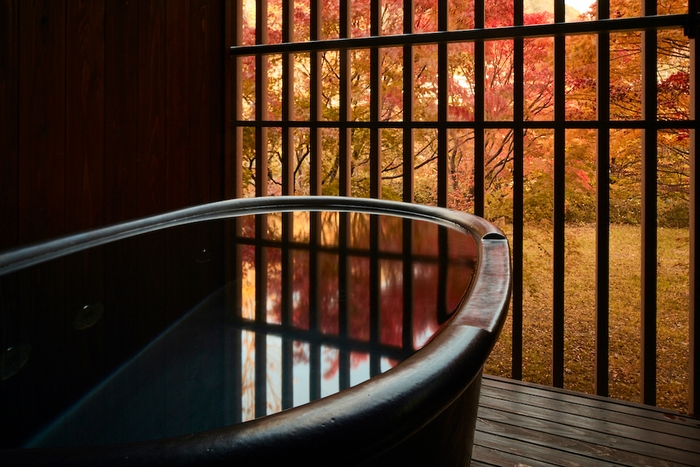 客室露天風呂付の客室では、湯船に身をゆだねながら、紅葉を眺めることができます。心地よい秋風を感じながら癒しのひとときをお楽しみください。