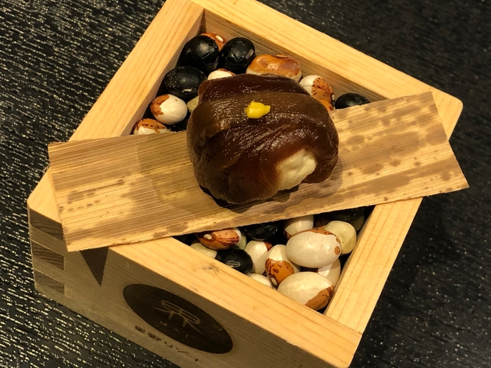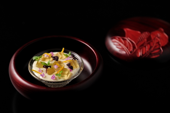 地元おなじみの「湯波」、「豆乳」、「献上醤油」を使った一品を会席料理の最初の一品として提供します。日光の湯波は、大豆の味わいが濃厚であるのが特徴です。そこで、うま味が充実したビーフコンソメを合わせたうえで、味わいの調和をとるために、風味豊かな献上醤油を隠し味に加えています。滑らかな湯波のムースと、口溶けのよいコンソメゼリーの組み合わせを楽しむことができます。