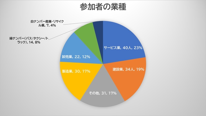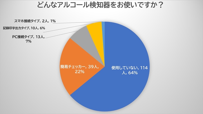 今回、多岐にわたる業種、多くの安全運転管理者の方にご参加頂くことができました。自社の過去の飲酒事案、現在使用している検知器や点呼等の運用状況等について率直なご回答をいただきました。