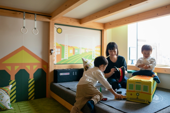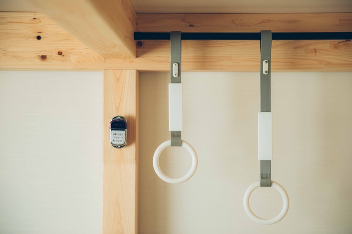 ソファの背もたれには、操縦レバーやボタンを模した飾りがついたクッションがあり、運転室のように楽しめます。運転士さんの帽子をかぶって、出発進行!クッションの上の壁紙には運転室から見える景色が描かれているので、まるで運転士さん気分で都電を運転しているような感覚のソファです。お部屋の中には実際に都電で使われていた、つり革や降車ボタンもあるので、家族で電車ごっこも楽しめます。さらにカーペットにも線路がデザインされているので、電車の模型を走らせたり、車両型クッションにまたがって乗ったりと、何通りもの遊び方があるのも都電ルームならではかも?!