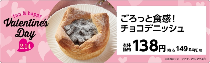 ●商品名:ごろっと食感!チョコデニッシュ ●本体価格:138円(税込価格:149.04円)※ ●発売日:2月6日(火) ●発売地区:全国(2023年12月末現在:1,834店)