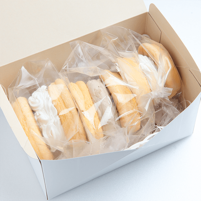 当店パティシエがメレンゲから1枚ずつ丁寧に焼き上げた「ふわふわのパンケーキ」と、3種類のお味が楽しめる生クリーム、解凍時間によって変わる食感をぜひお楽しみください。
