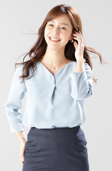 今回発売する商品はカットソーとブラウスで、サックス・ピンク・オレンジ・ラベンダー・ベージュといった多彩なカラーバリエーションを用意しました。カットソーはベーシックなデザインとし、ジャケットやカーディガンとの相性も抜群です。生地は光沢をもたせる特殊な加工により艶のある表面感が特徴のほか、撥水加工も施しているため、濃色生地では目立ちやすい汗染みも気になりません。ブラウスはVネックやハートネックのほか、胸元にフリルやギャザーなどをあしらった上品なデザインが魅力です。また、すっきりとしたシルエットも特徴で、様々なボトムとコーディネートしやすい商品を揃えています。
