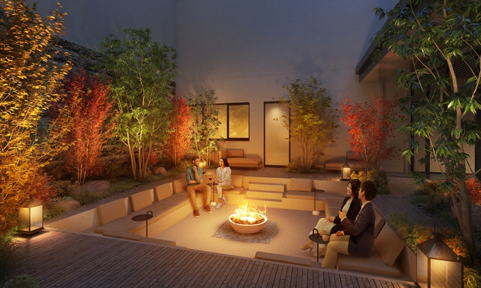 ホテル棟の中央に火を囲むファイヤープレイスを設置。