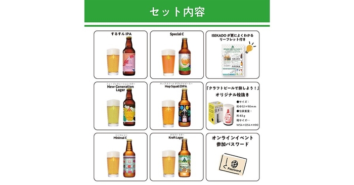 オンラインイベントに合わせ、【クラフトビールで旅しよう!オンラインイベント限定詰合せセット】をセットアップしております。当社では6本のアソートセットをご用意いたしました。
